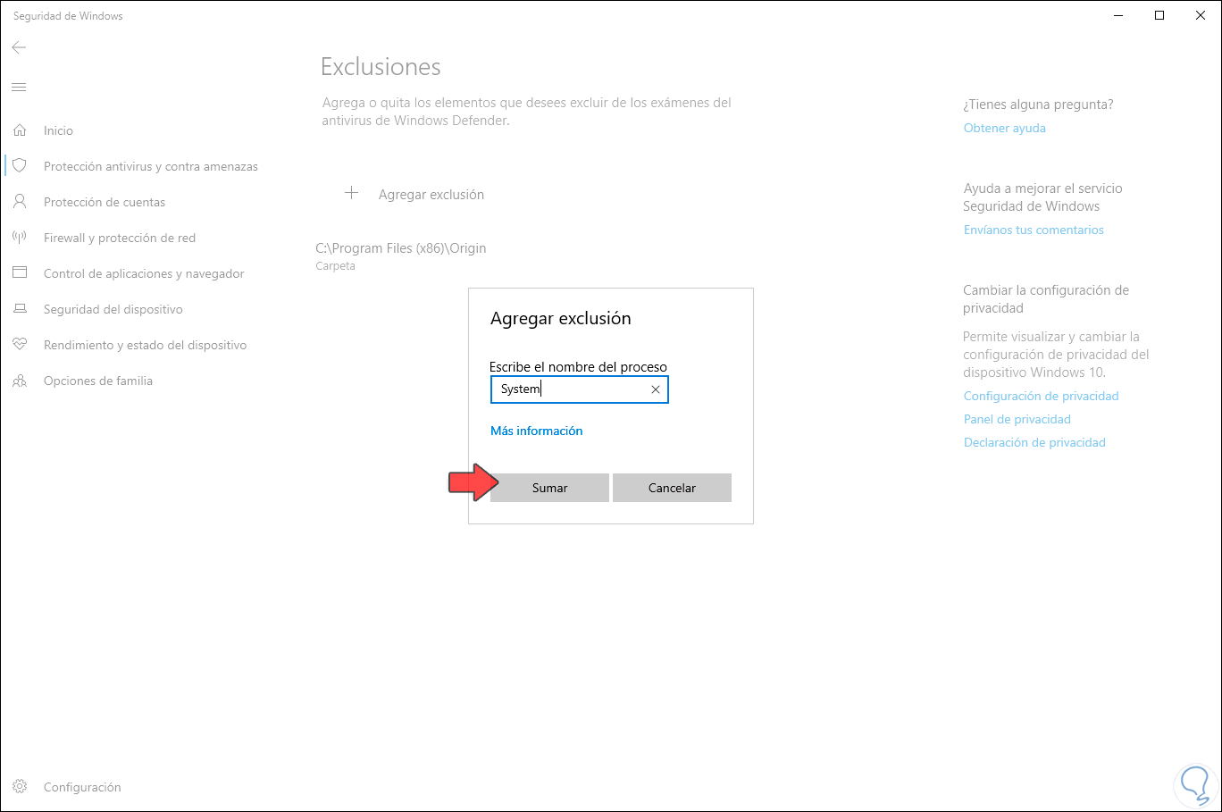 Damos clic en “Sumar” y lo veremos dentro de las exclusiones de Windows Defender: