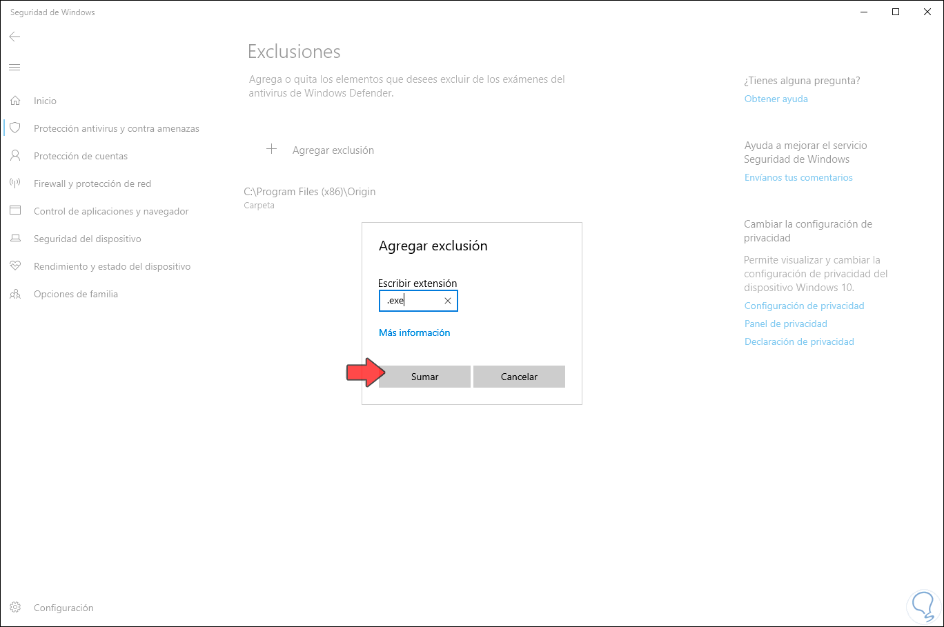 Si seleccionamos “Tipo de archivo” simplemente debemos ingresar la extensión a excluir del análisis de Windows Defender. Damos clic en “Sumar” para añadirlo.