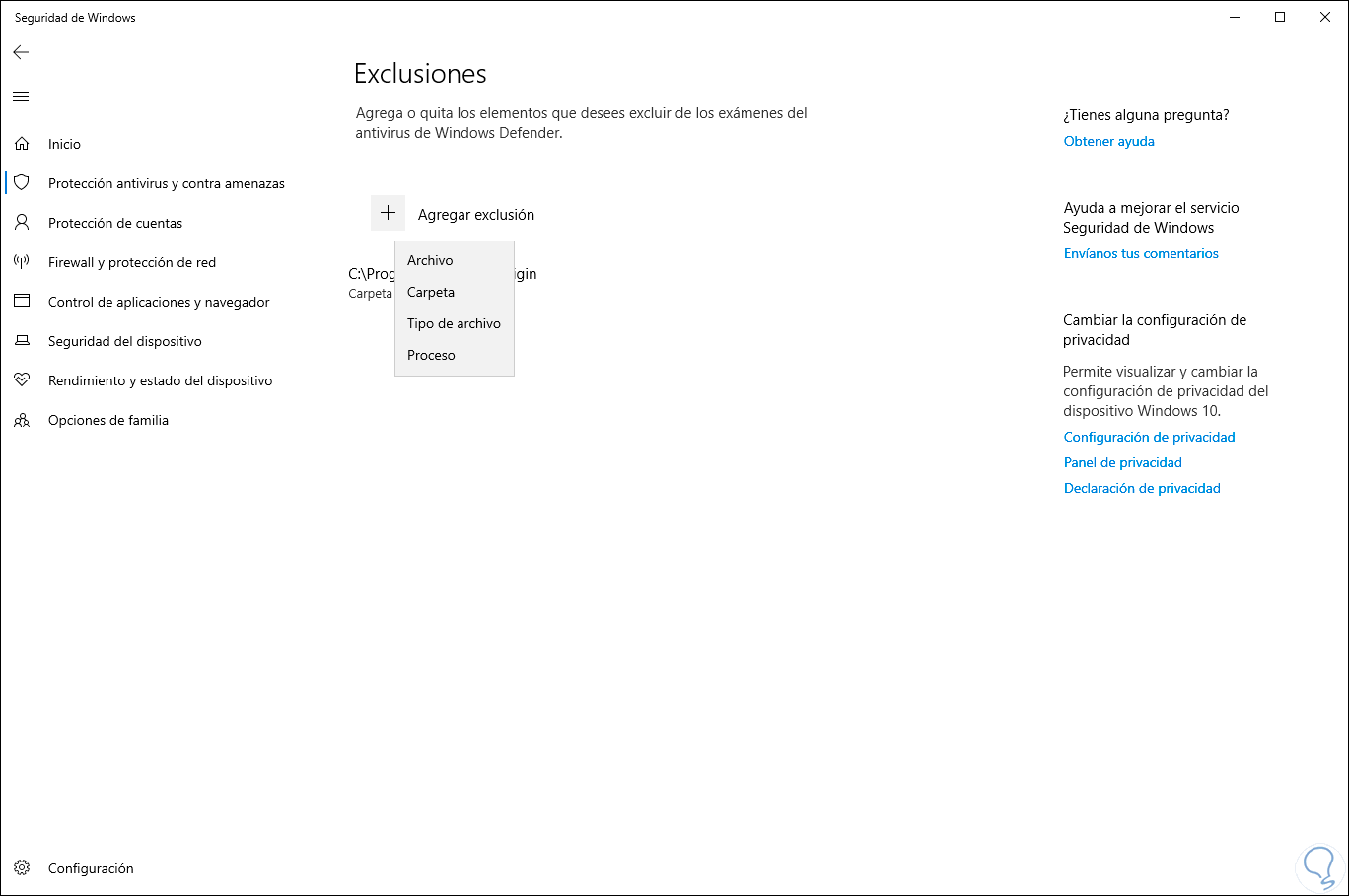 Damos clic en “Agregar exclusión” y disponemos de las siguientes opciones a excluir:
