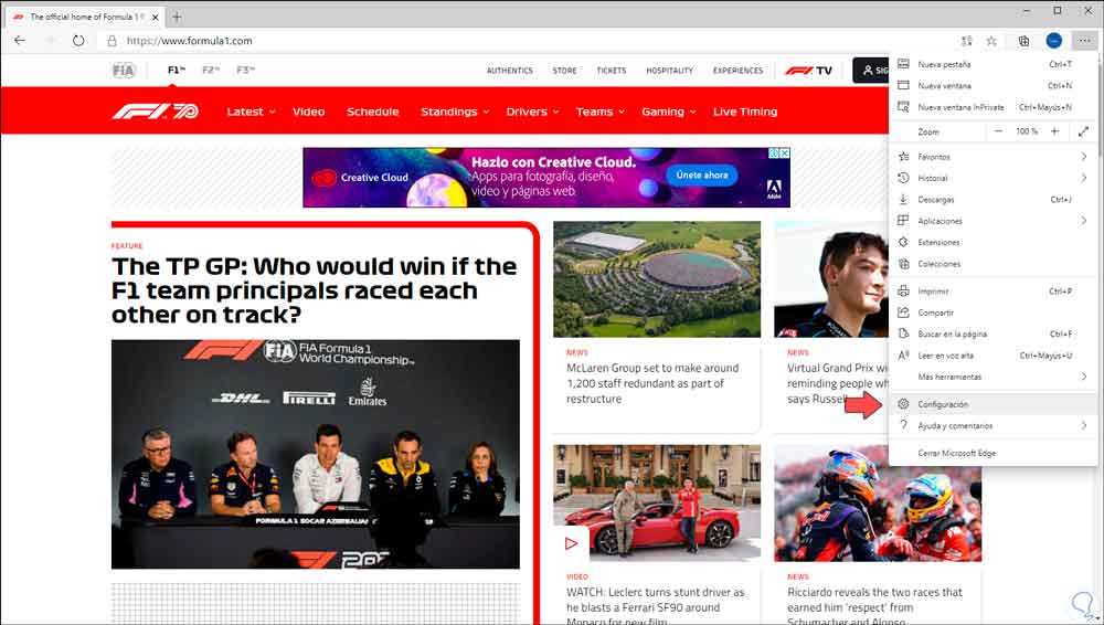En caso de que las opciones anteriores no sean visibles, es posible que la traducción no esté habilitada, para validar esto, damos clic en el botón “Configuración y más” y vamos a “Configuración”: