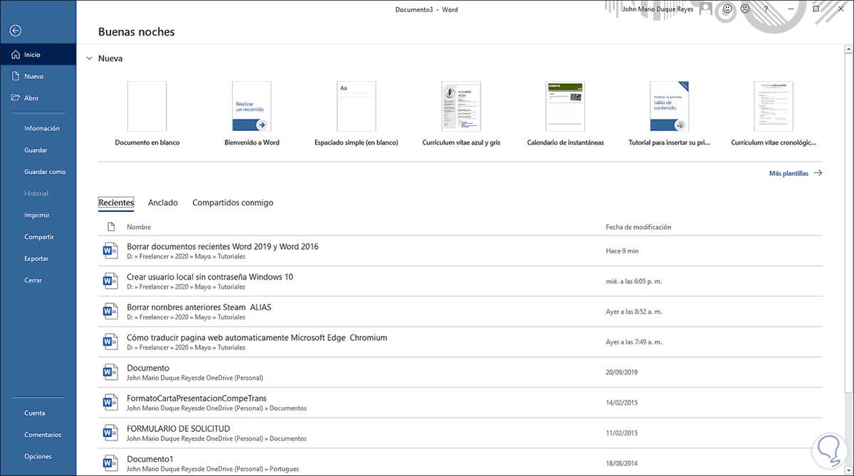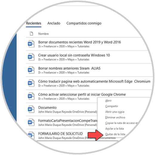 Este proceso aplica por igual para Word 2016 o 2019. Para ello abrimos la aplicación Word y en la primera ventana que vemos estarán allí los archivos recientes, damos clic derecho sobre el archivo que deseamos borrar y veremos lo siguiente: