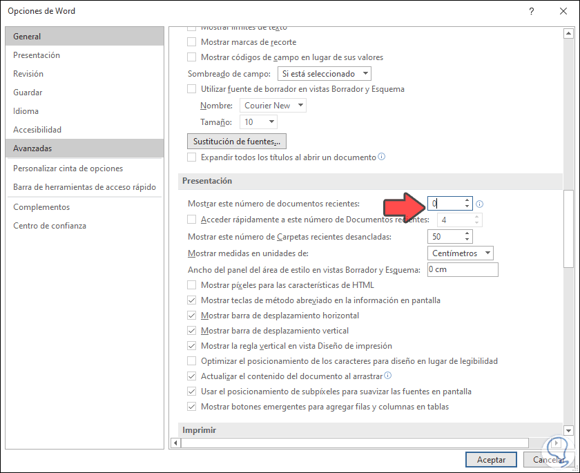 Para lograr esto iremos al menú Archivo – Opciones, en la ventana emergente vamos a la categoría “Avanzadas” y allí vamos a la sección “Presentación” y en el campo “Mostrar este número de documentos recientes” establecemos su valor en cero (0):