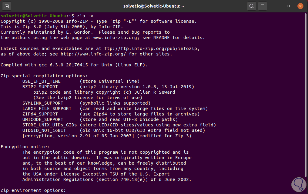 Tras su instalación comprobamos la versión de ZIP instalada ejecutando: