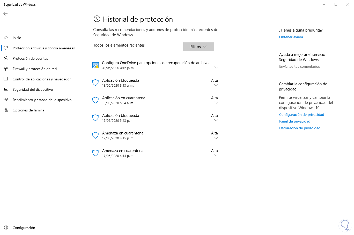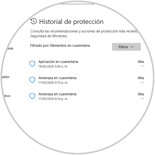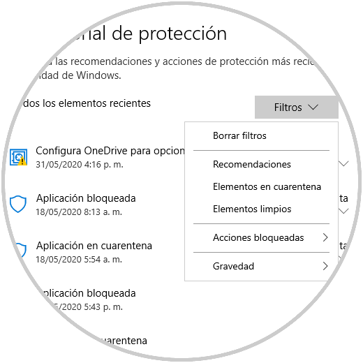 Este historial de protección puede filtrarse por diferentes secciones que son categorizadas por Windows Defender como: