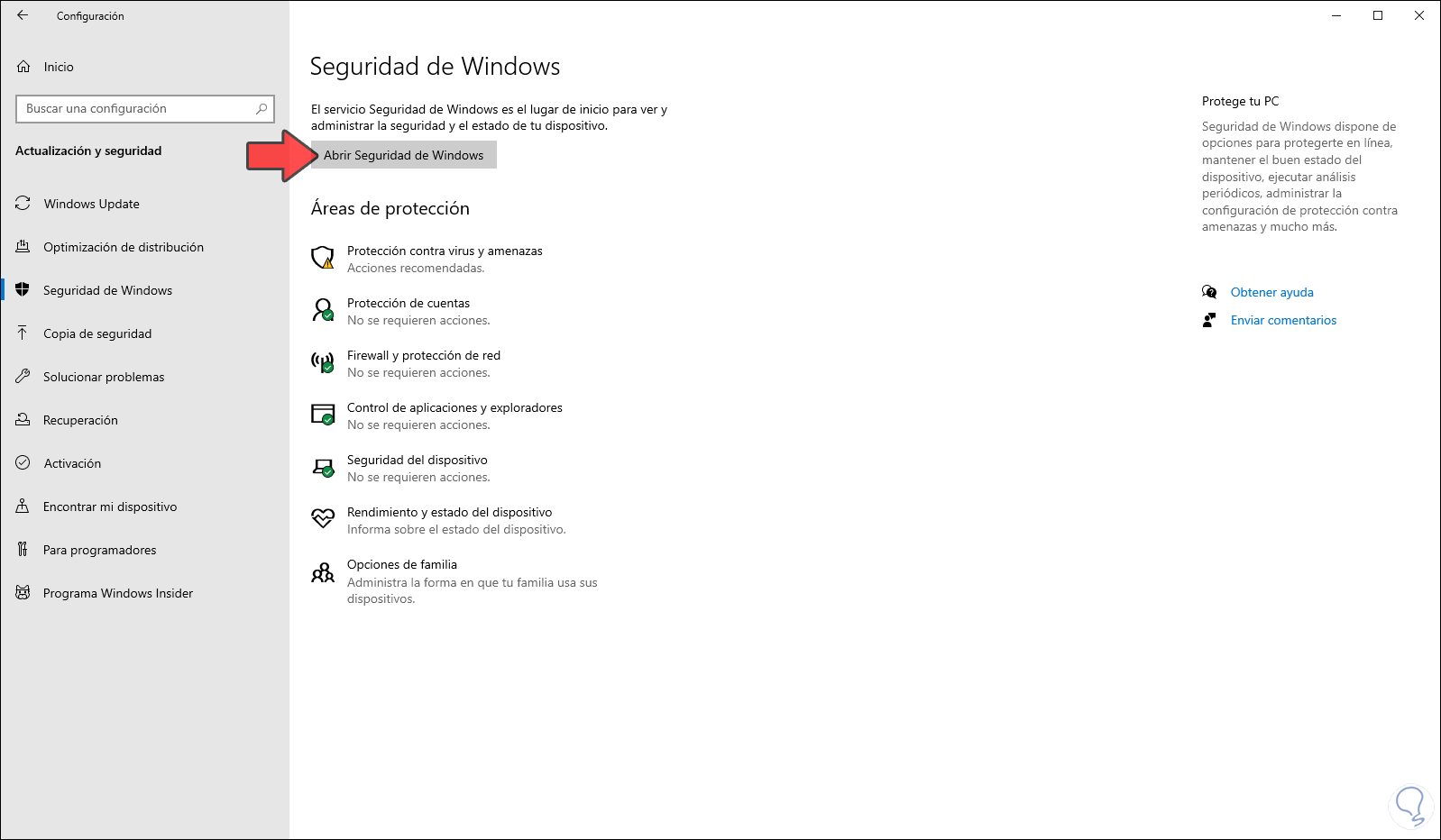 Damos clic en “Abrir seguridad de Windows” y se desplegara lo siguiente:
