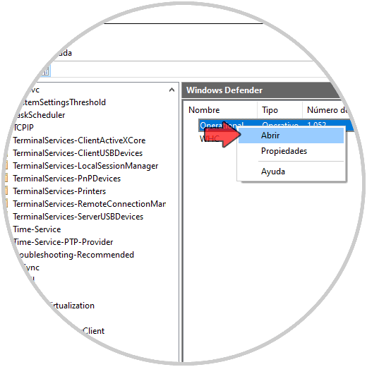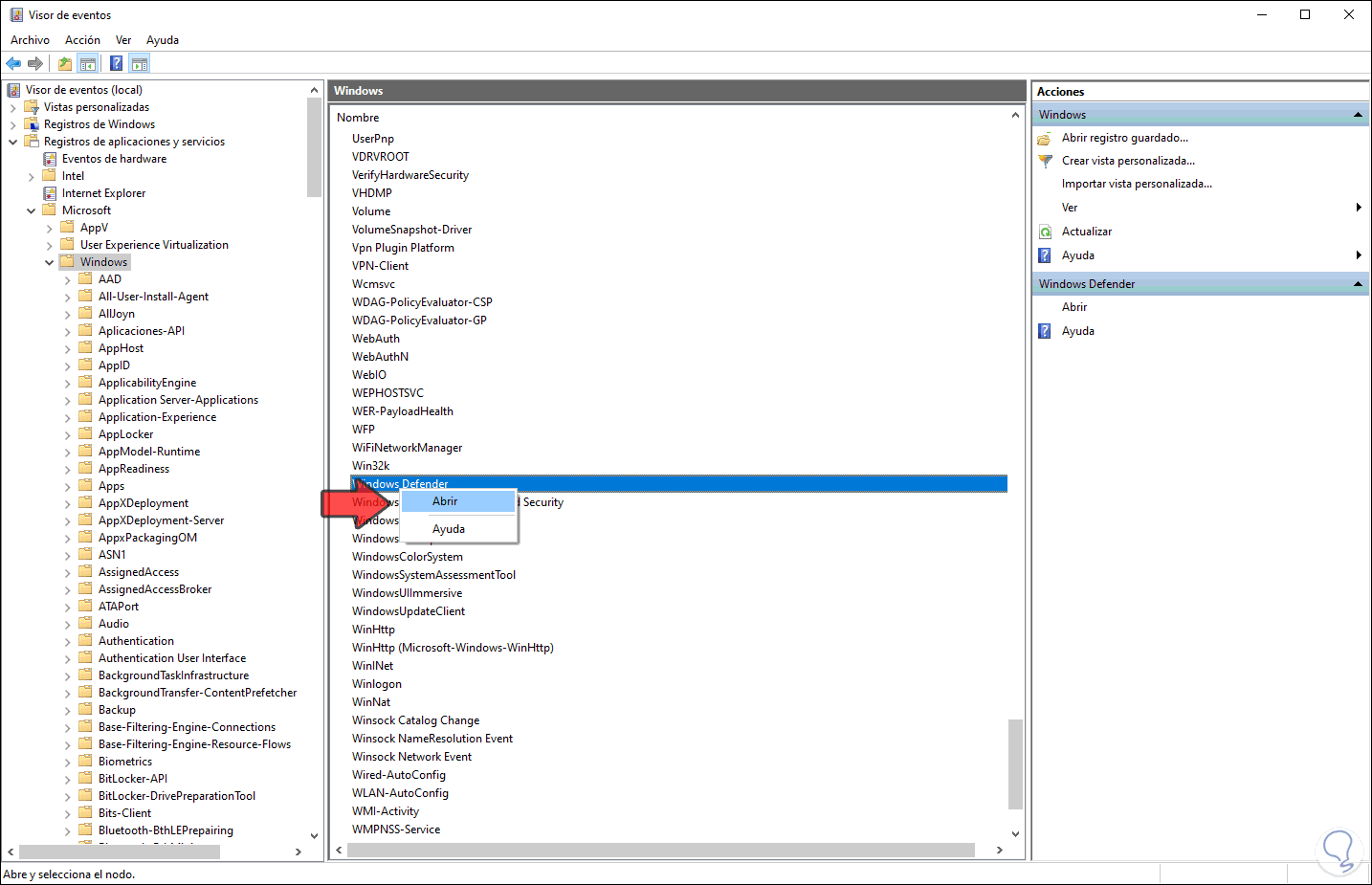 Pulsamos Aceptar o Enter y en el visor de eventos vamos a la sección “Registros de aplicaciones y servicios – Microsoft – Windows”, allí ubicamos “Windows Defender” en el costado lateral y damos clic derecho sobre el para seleccionar “Abrir”: