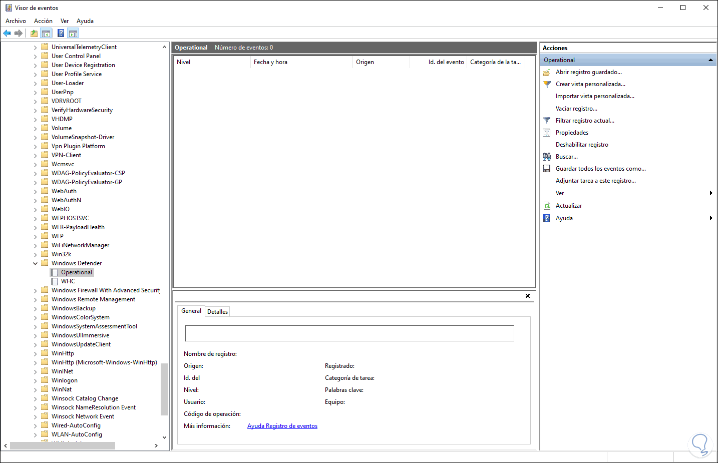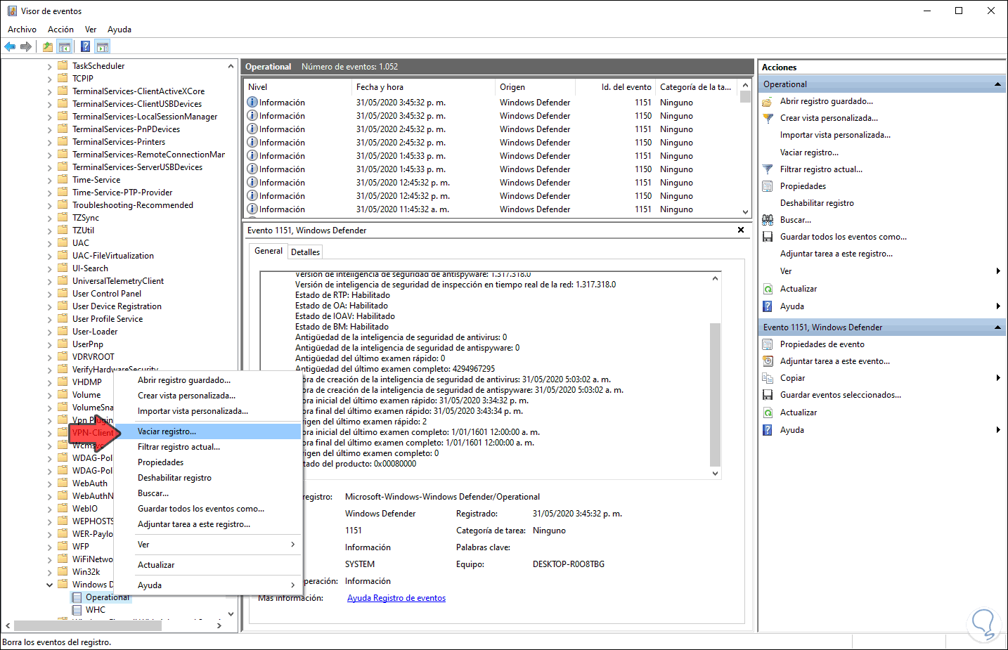 Damos clic derecho sobre “Operational” en el costado lateral izquierdo y seleccionamos “Vaciar registro”: