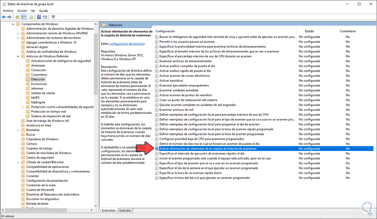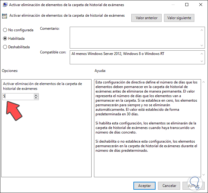Esta política tiene la tarea de especificar cuantos días estarán los elementos en la carpeta del historial de Windows Defender, el valor por defecto es de 30 días. Damos doble clic sobre ella y activamos la casilla “Habilitada” y definimos cuantos días estarán los elementos allí: