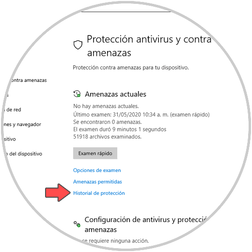 Allí vamos a la categoría “Protección antivirus y contra amenazas” y damos clic sobre la línea “Historial de protección” en la sección “Amenazas actuales”.