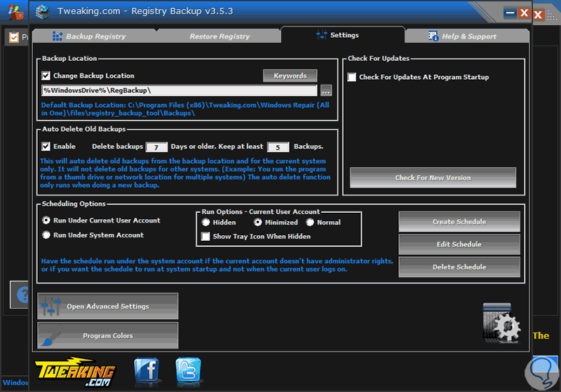 Después de esto será posible acceder a la configuración de esta sección dando clic sobre el botón “Open registry/backup settings” y allí podemos configurar aspectos como: