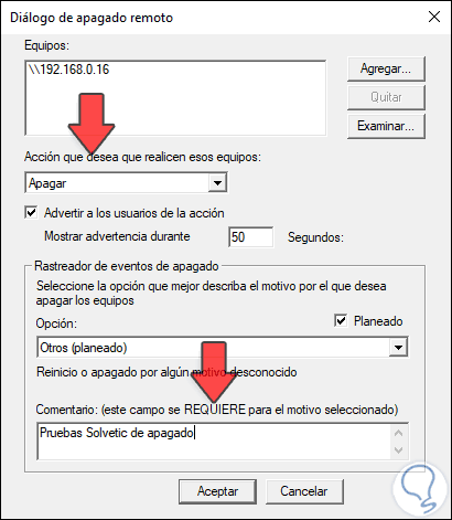 - Ingresar el mensaje de apagado que será desplegado remotamente