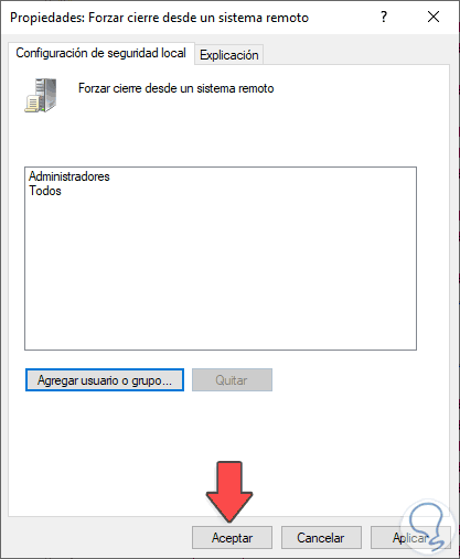 Como mencionamos, con esto se conceden los permisos para que el usuario pueda apagar el equipo de forma remota.