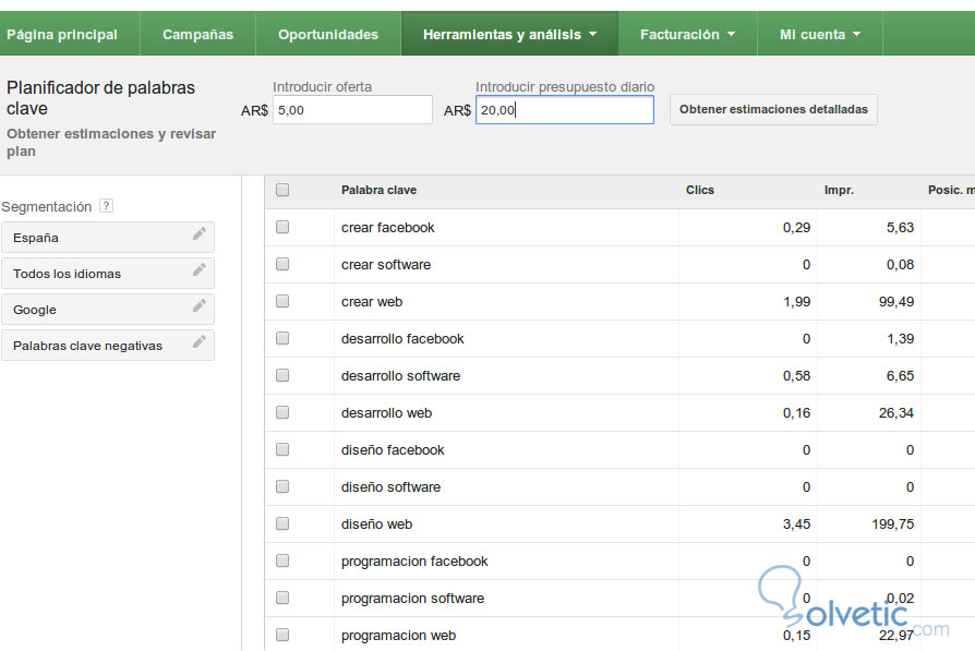 En esta opción podemos obtener estadísticas, como el volumen de búsquedas, para decidir qué palabras clave utilizar en una campaña nueva o existente. Algunas estimación para palabras claves son la cantidad estimada de clics, para obtener una estimación del rendimiento de una palabras clave o varias palabras claves para estimar los costos y planificar un presupuesto. Estas estimaciones también pueden ayudarlo a decidir qué ofertas y presupuestos desea establecer.