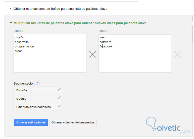 Esta es la herramientas mas interesante e innovadora, permite tener dos listado de palabras claves y luego la herramienta se encarga de generar combinaciones y estimar el costo y búsquedas.
