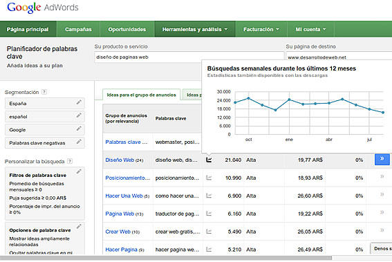 Para acceder a esta herramienta debemos tener una cuenta en Google Adword. Luego entramos al menu Herramientas y análisis > Planificador de palabras claves