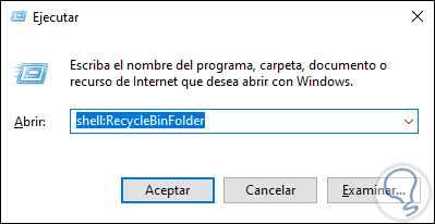 Esta opción consiste en la ejecución de un simple comando para acceder a la papelera, usamos la combinación de teclas siguiente y en la ventana desplegada ingresamos lo siguiente.