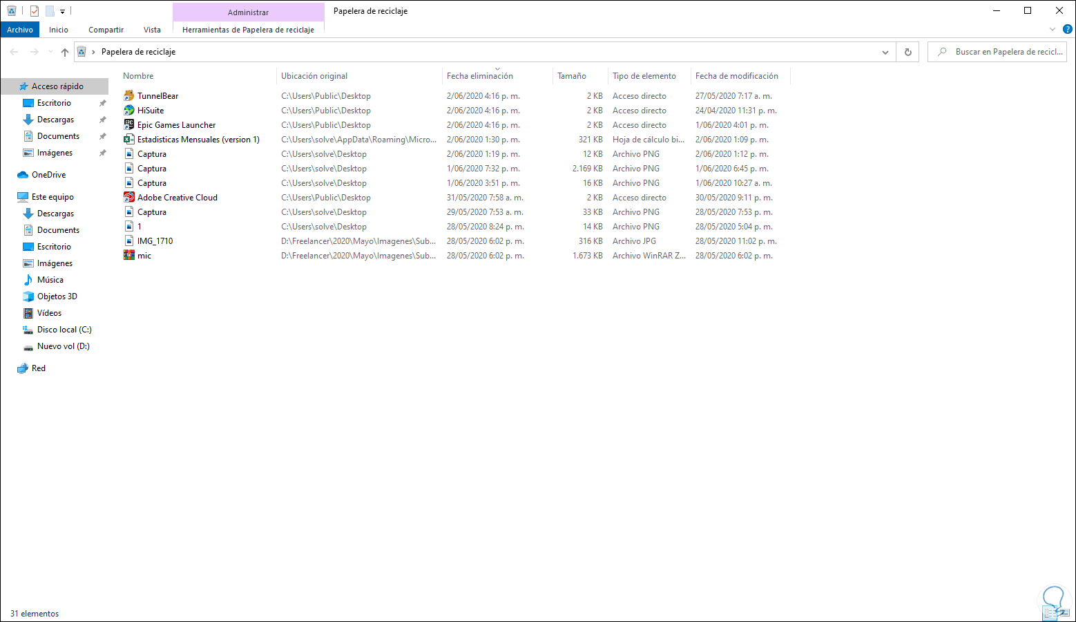 Damos clic en Aceptar o pulsamos Enter para acceder a la papelera.