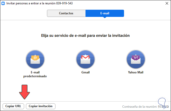 Ahora que ya hemos creado la reunión podemos invitar a usuarios a ella desde el apartado de “Invitar” y elegimos el método, ya sea copiando el enlace o enviándolo por correo.