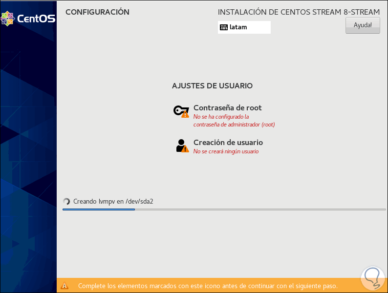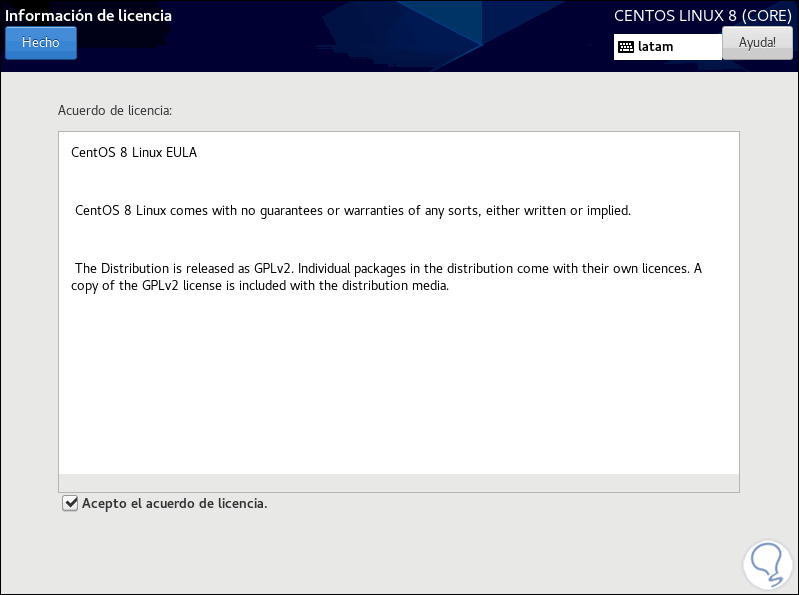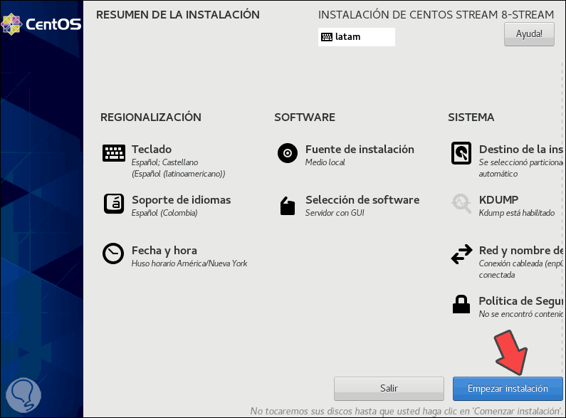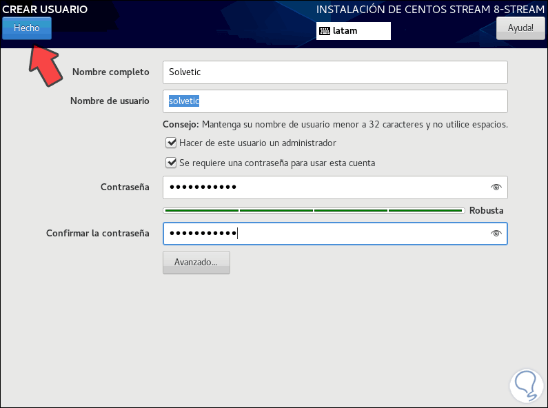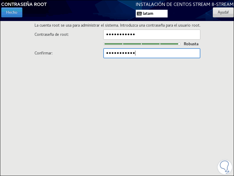 Damos clic en “Hecho” y continuaremos con la instalación de CentOS Stream: