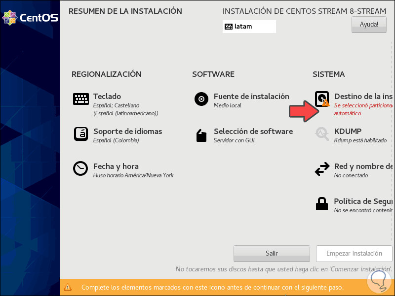 Luego accedemos a la siguiente ventana. Allí será necesario que los campos con advertencia sean completos. En primer lugar, vamos a “Destino de la instalación” donde debemos seleccionar el disco duro local: