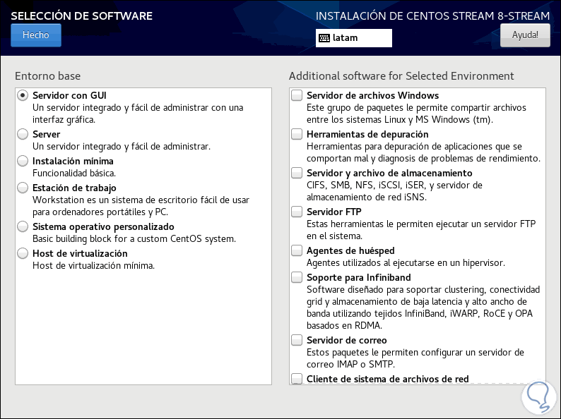 Es posible ir a la sección “Selección de software” para elegir que complementos o entornos deseamos para CentOS Stream: