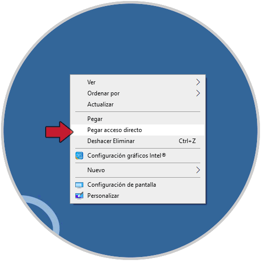 Vamos al escritorio y allí damos clic derecho y esta vez seleccionamos “Pegar acceso directo”: