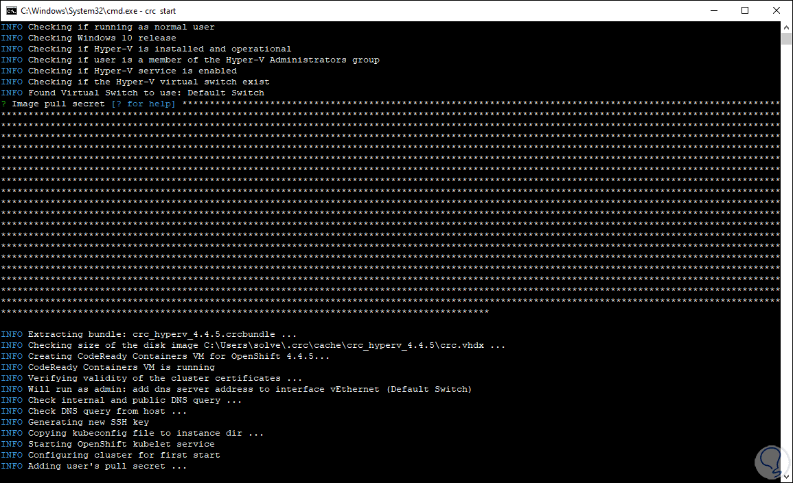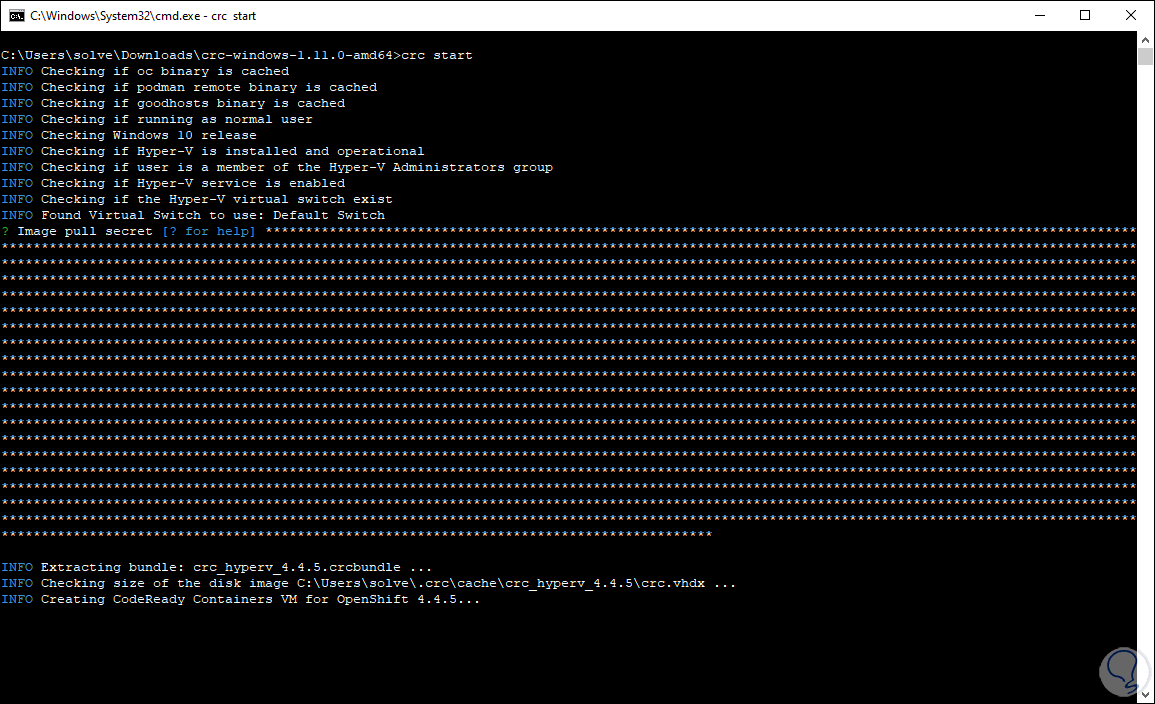 Un requisito en Windows 10 es que debemos contar con Hyper-V habilitado, podemos ejecutar el comando “crc setup” para validar que el equipo cuente con todos los requisitos antes de crear el clúster: