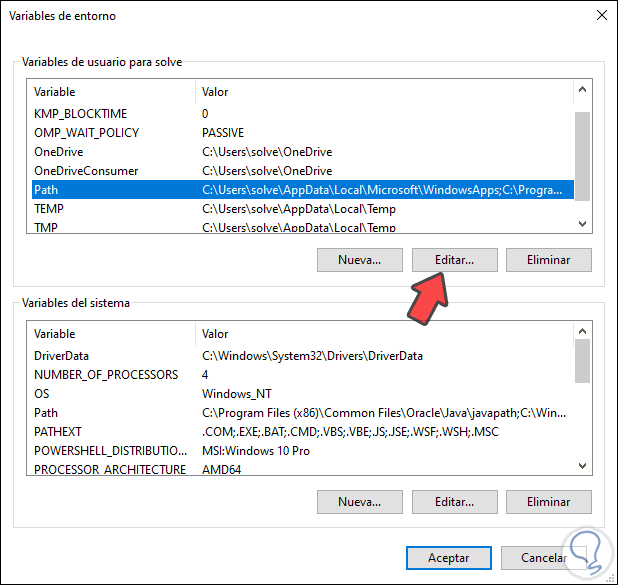 En la siguiente ventana seleccionamos PATH y damos clic en Editar: