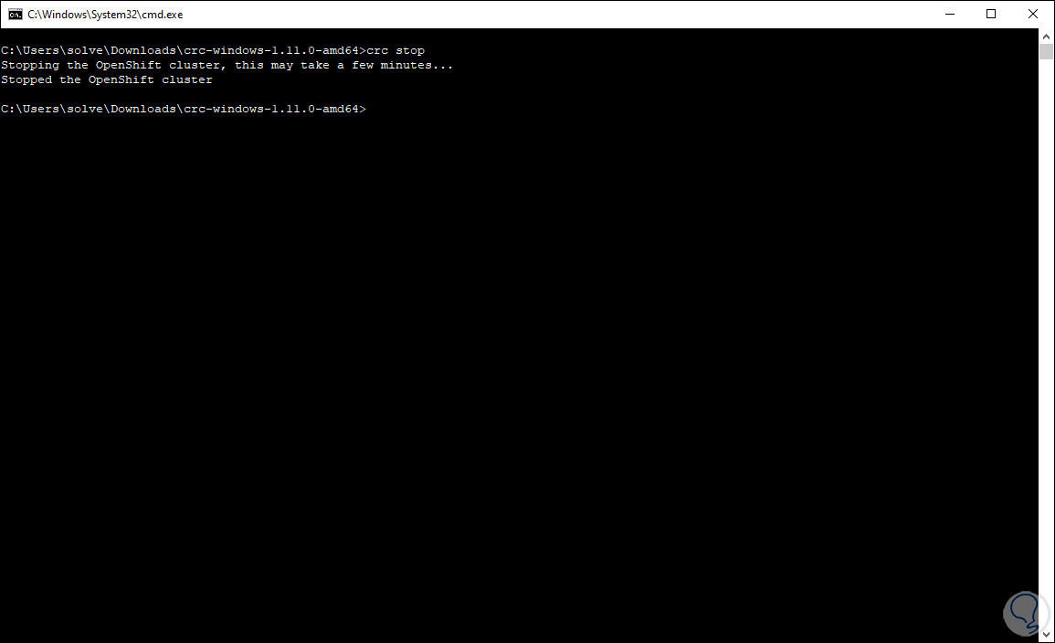Cuando no usemos el clúster ejecutamos “crc stop” para apagarlo: