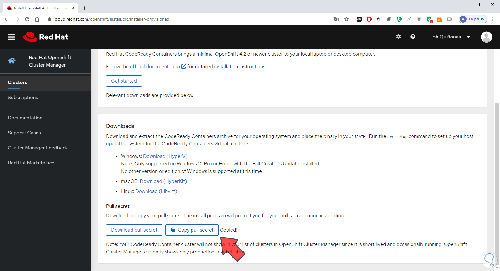 Allí debemos ingresar el “pull secret”, para ello vamos de nuevo al link de OpenShift y podemos copiar el Pull Secret: