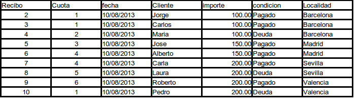 Vamos crear un ejemplo de una tabla html o generada por una consulta a base de datos de un listado de cobros de cuotas a clientes.
