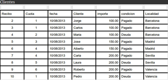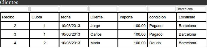 Es importante que el nombre de cada columna sea encabezado <th></th> y aparecen unas casillas de texto sobre cada columna para poder filtrar asi por ejemplo si busco clientes solo de barcelona escribo en la columna localidad la busuqeda y doy un Intro.