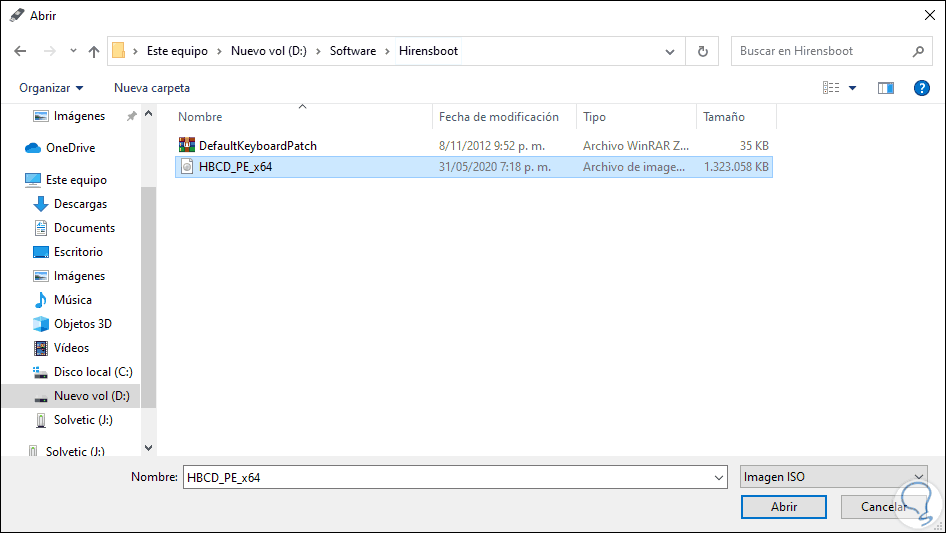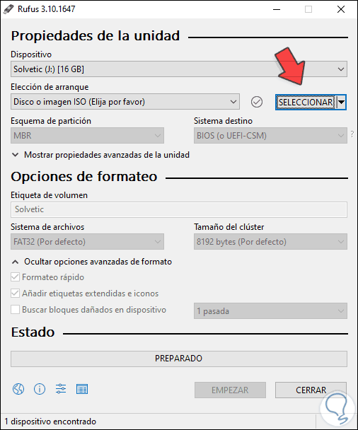 De manera automática se detecta la UJSB conectada al equipo en el campo “Dispositivo”, luego damos clic en “SELECCIONAR” e iremos a la ruta donde hemos descargado la imagen ISO de Hirens Boot PE: