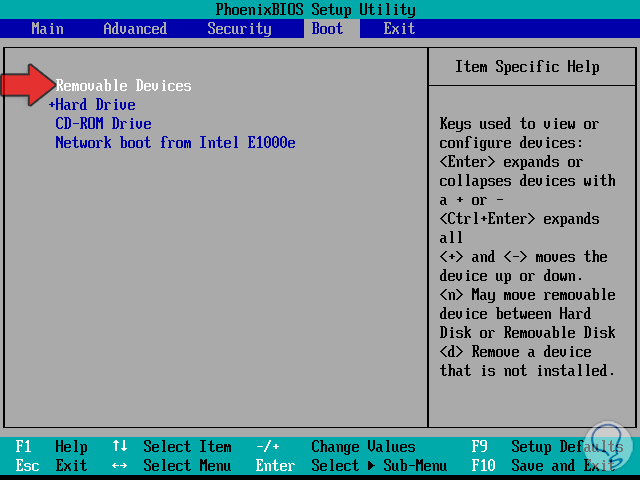 El siguiente paso a dar era acceder al BIOS del equipo donde no podemos iniciar sesión y allí vamos a la pestaña Boot y allí seleccionamos la opción “Removable Devices”:
