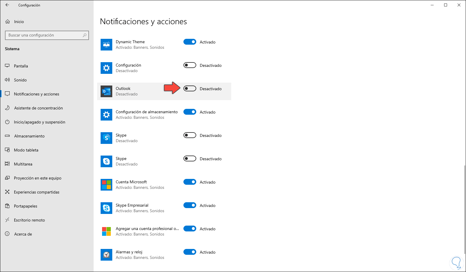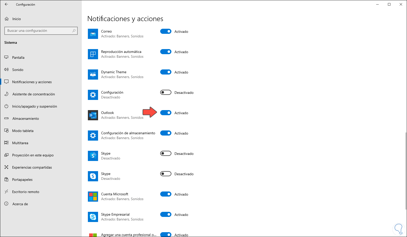 Allí vamos a la peste inferior y buscamos “Outlook”, para activar las notificaciones habilitamos el interruptor y para desactivarlas simplemente pulsamos sobre el para inhabilitarlo: