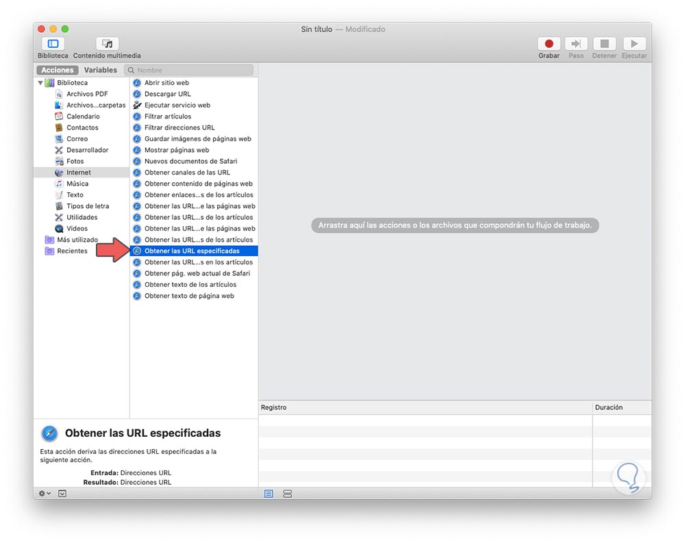 Seleccionamos el flujo de trabajo y en la ventana desplegada seleccionamos “Internet” en la sección lateral “Biblioteca” y en la sección principal elegimos “Obtener las URL especificadas: