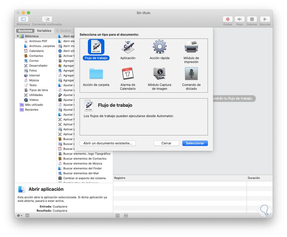 - Flujo de trabajo: esta opción crea un flujo de trabajo el cual se ha de ejecutar dentro de la aplicación Automator