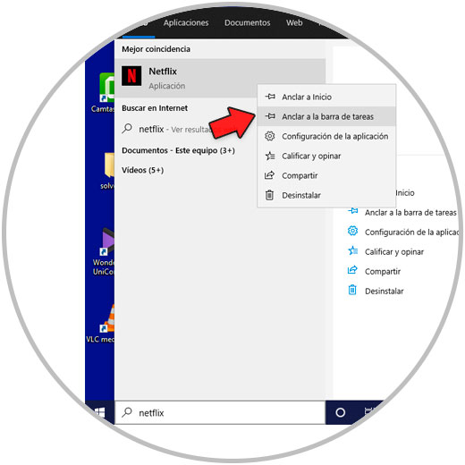 Ahora, vamos a anclar Netflix a la barra de tareas de Windows 10 para poder acceder también de manera directa desde aquí. Para esto, escribimos “Netflix” en la barra de búsqueda de Windows 10. Cuando aparezca la App de Netflix hacemos click derecho, y en la ventana emergente seleccionamos “Anclar a la barra de tareas”.