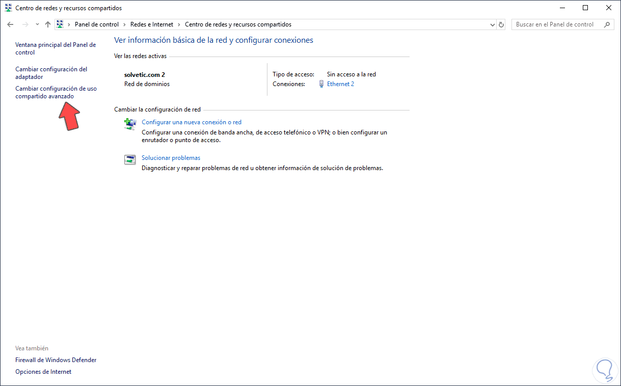Damos clic en la línea “Cambiar configuración de uso compartido” en el costado lateral izquierdo y en la nueva ventana que será desplegada vamos a la sección “Dominio” y allí activamos la casilla “Activar la detección de redes”: