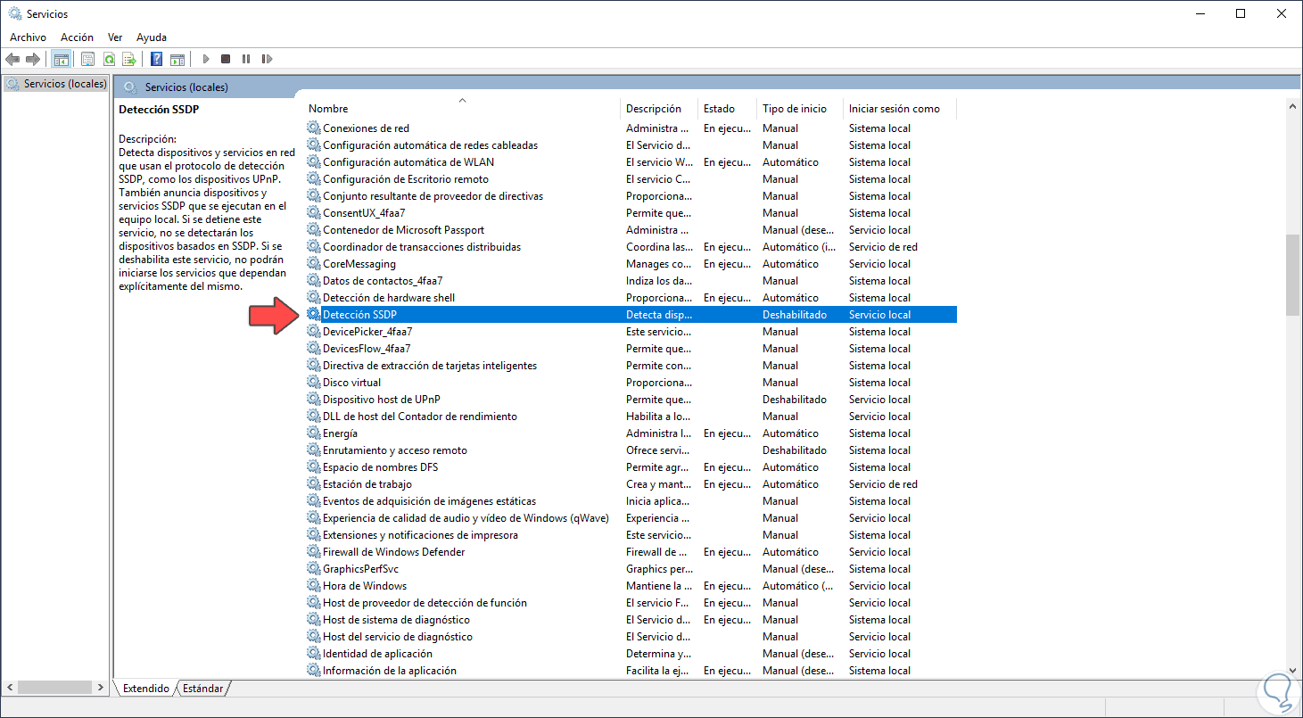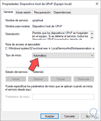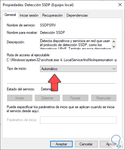 Damos clic en Aplicar y luego damos clic en Iniciar, aceptamos los cambios. Buscamos el servicio llamado “Detección SSDP”: