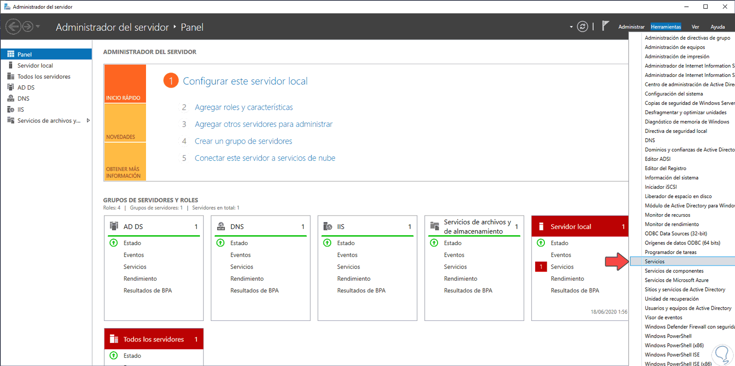 Es momento de activar algunos servicios los cuales permiten el óptimo funcionamiento de la detección de redes, para esto vamos al Administrador del servidor y allí vamos a “Herramientas” y seleccionamos “Servicios”: