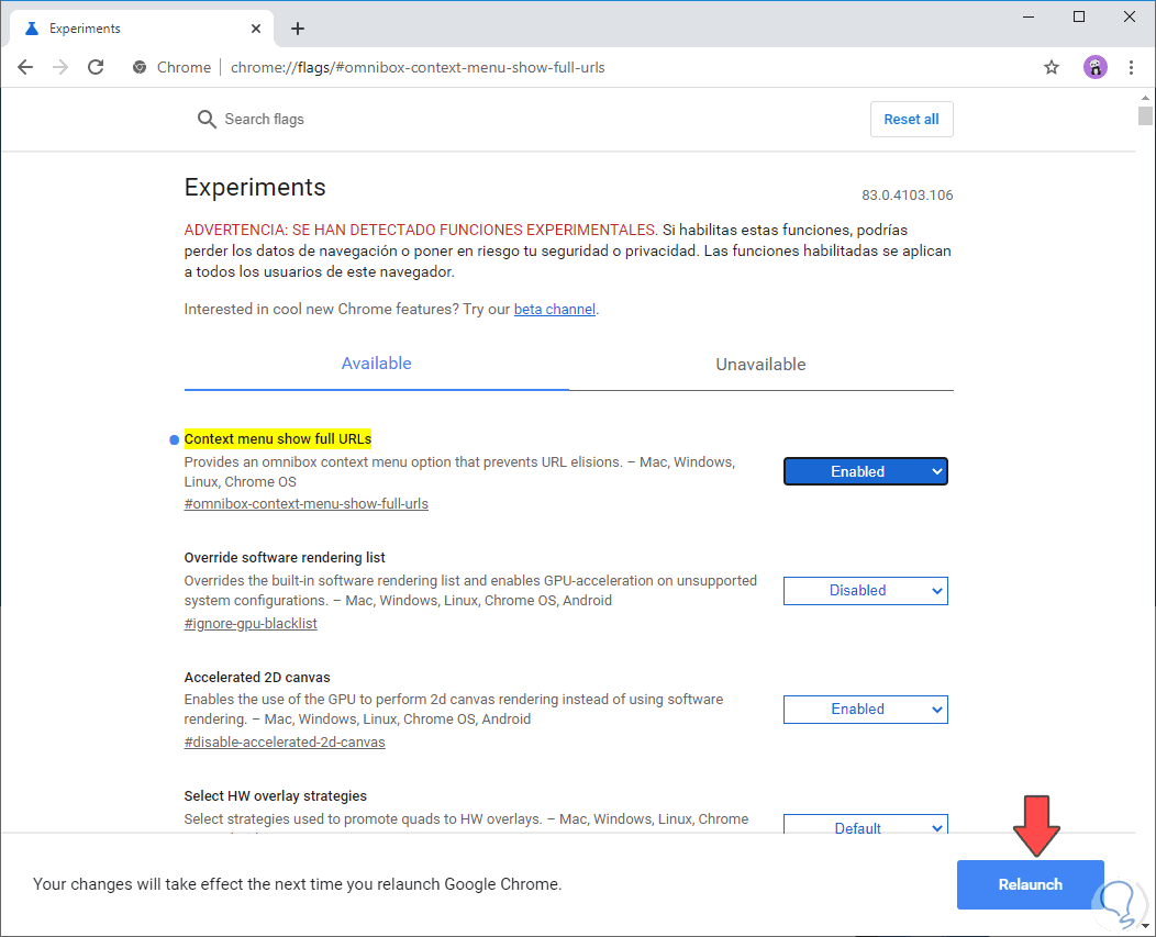Ahora pulsaremos sobre “Relaunch” para aplicar los cambios reiniciando Chrome.