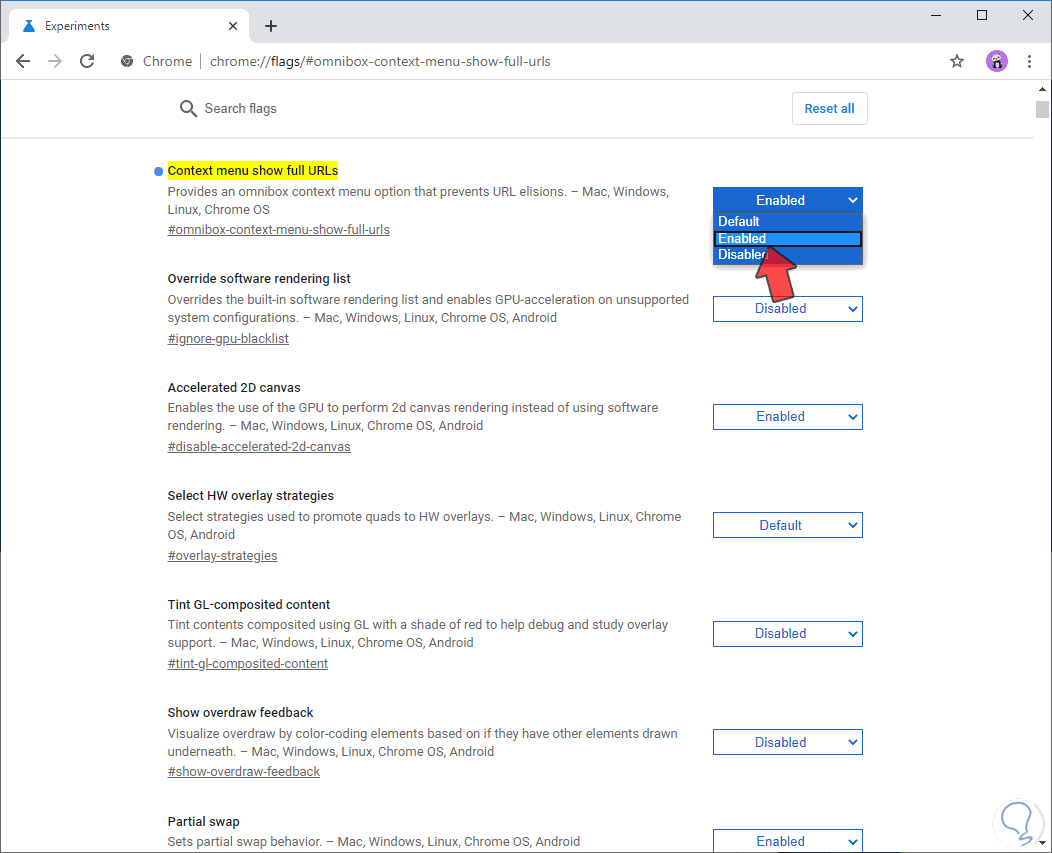 Aquí veremos resaltada la opción de “Context menu show full URLs”, pulsa en sus opciones y elige “Enabled”