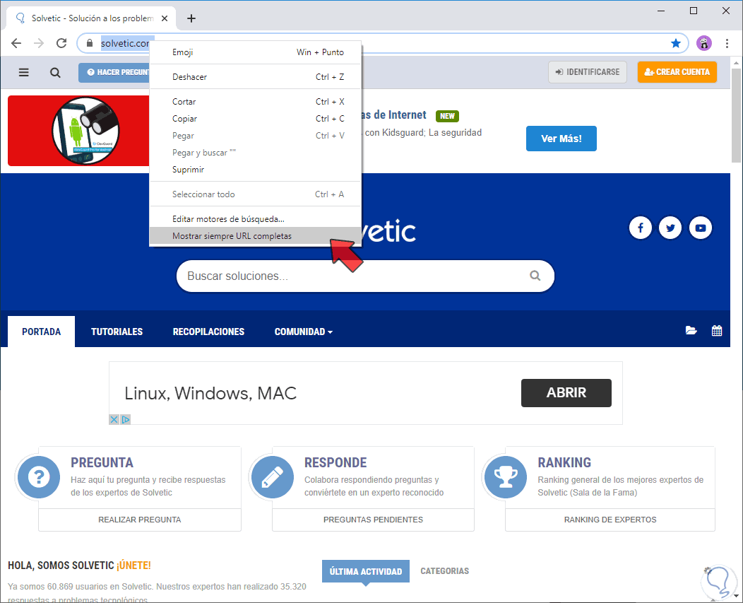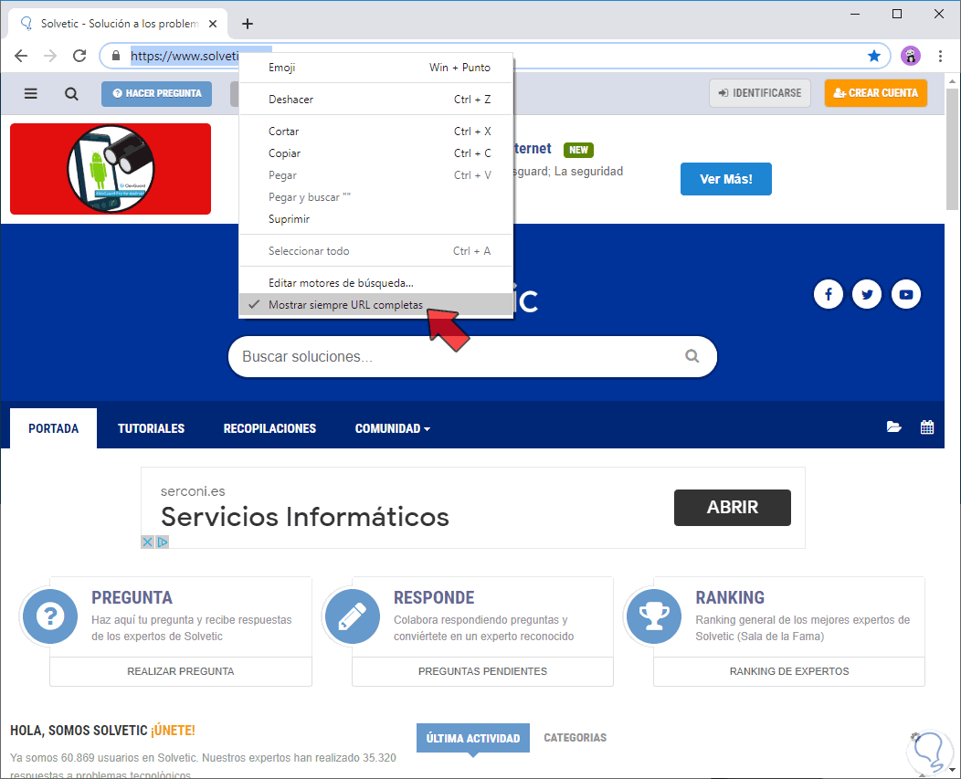 Ve a la URL, selecciónala y haz clic derecho. Aquí verás que aparece una opción llamada “Mostrar siempre URL completas”, pulsa sobre ella para activarla.