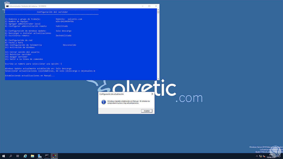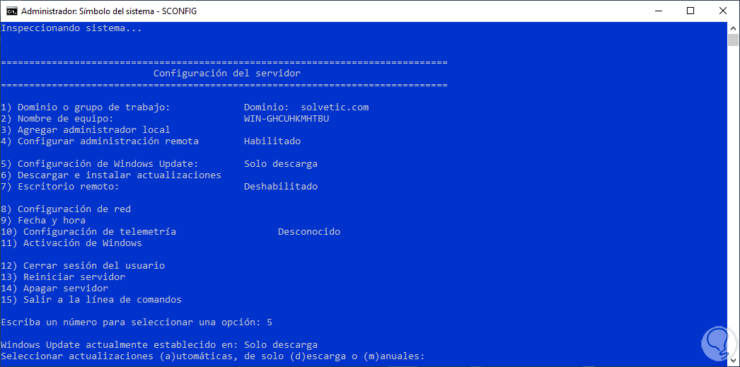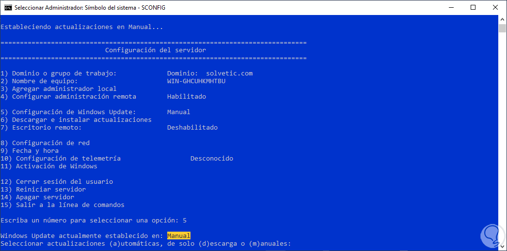 Damos clic en Aceptar y luego podemos ingresar de nuevo el numero 5 y validamos que el estado actual de Windows Update es manual: