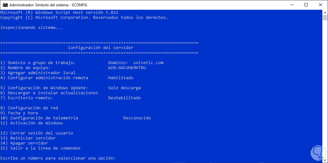 Para lograr esto en el servidor, debemos ir a la consola del símbolo del sistema como administradores y allí ejecutar el comando SCONFIG: