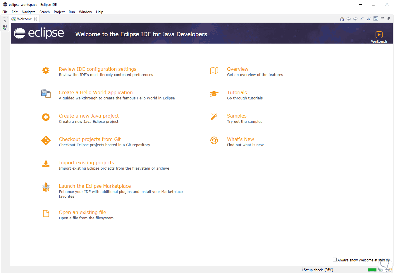 Después de esto accedemos al entorno de Eclipse IDE para Windows 10: