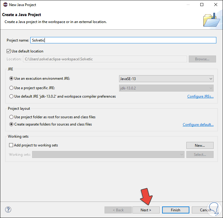 En este caso seleccionamos la opción “Eclipse IDE for Java Developers” e inmediatamente veremos la siguiente ventana donde podemos establecer lo siguiente: