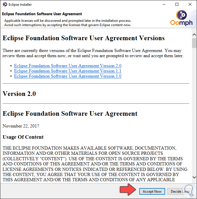 Allí damos clic en el botón “Install” y se desplegará la licencia de usuario de Eclipse:
