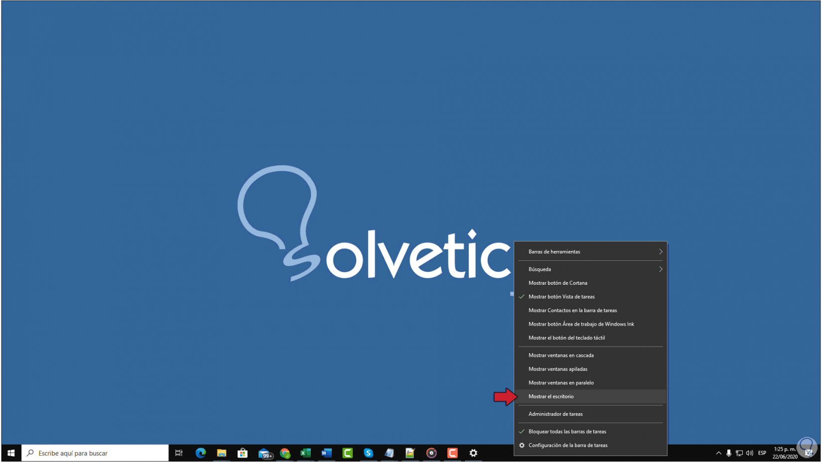 Esta opción se encarga de minimizar todas las ventanas del escritorio de forma simultánea, para ello damos clic derecho en la barra de tareas y en el listado desplegado seleccionamos “Mostrar el escritorio”: